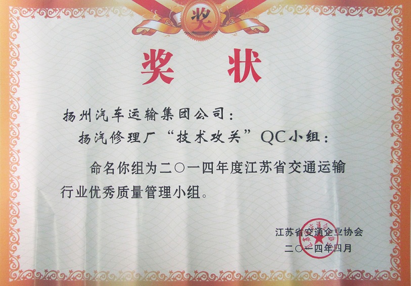 又訊:在此前進(jìn)行的江蘇省交通運(yùn)輸行業(yè)優(yōu)秀QC小組成果評(píng)選中,集團(tuán)公司被表彰為“省交通運(yùn)輸行業(yè)質(zhì)量管理小組活動(dòng)優(yōu)秀企業(yè)”,揚(yáng)州汽車(chē)站“驛站快件”QC小組(成果《降低到達(dá)庫(kù)收發(fā)貨的誤差率》)與修理廠“技術(shù)攻關(guān)”QC小組(成果《汽車(chē)變速箱小車(chē)式托架的研制》)被評(píng)為“省交通運(yùn)輸行業(yè)優(yōu)秀質(zhì)量管理小組”。