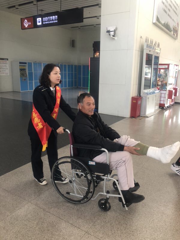 不一會(huì)兒,陪同的工友買好了當(dāng)天10:30分前往昆山的車票。高娟和另一位工作人員彭素青借來(lái)了輪椅,二人推著他來(lái)到了二樓發(fā)車檢票口,將他攙扶到座椅上坐好,并和發(fā)車班工作人員交接了尤師傅的情況,囑托他們多多照應(yīng),安排好一切后,高娟和彭素青才離開(kāi)回到自己的工作崗位。尤師傅和工友都非常感謝揚(yáng)州站工作人員細(xì)心周到的服務(wù)。