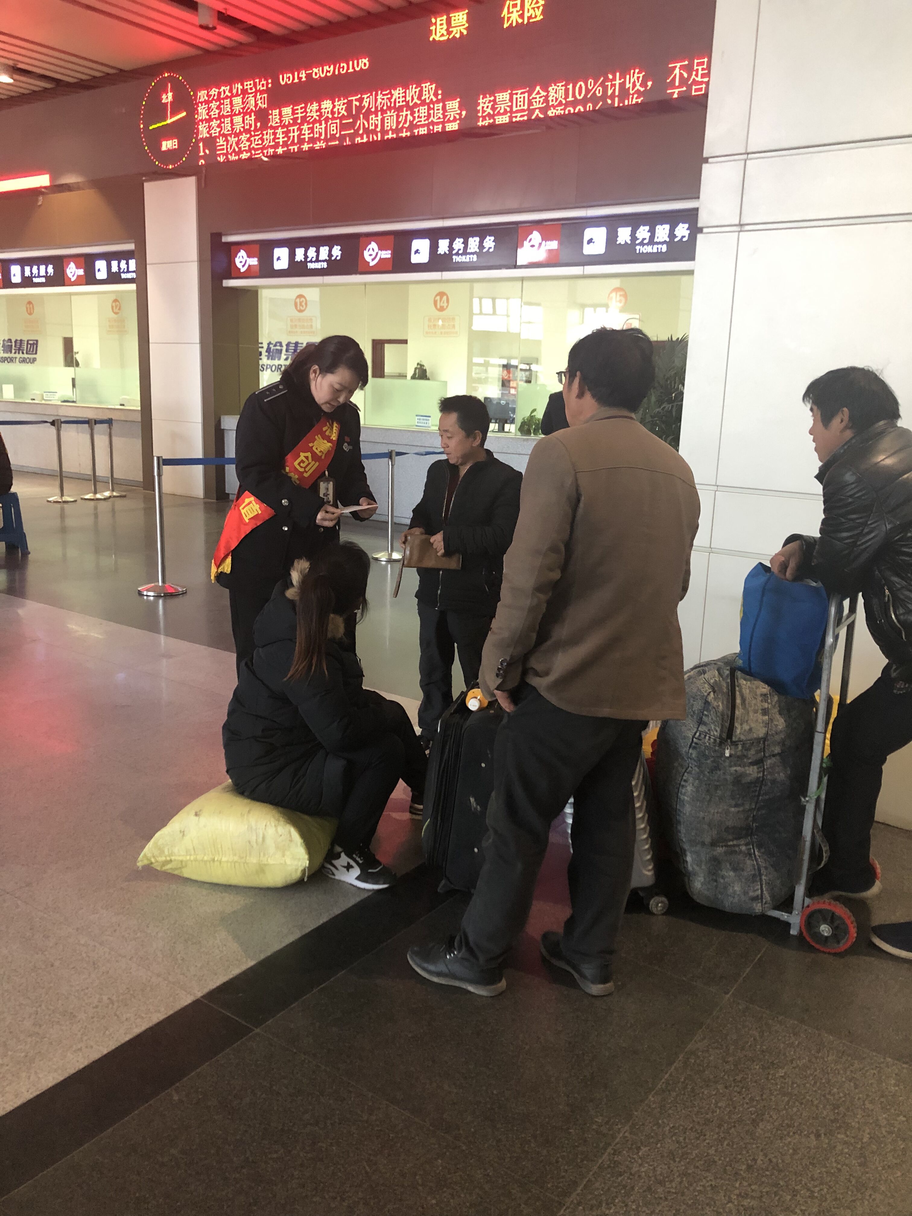 “一定是遇到了什么困難。”工作經(jīng)驗豐富的尹海霞隨即走上前去了解情況。原來,這四個農(nóng)民工兄弟在揚州某藥廠打工,今天剛拿到工錢,回家心切,便提前來到了車站,一起回河南商丘老家過年,“辛苦了一年,總得帶點揚州的特產(chǎn)回家給親人們啊”,身患?xì)埣惨呀?jīng)四十多歲的王師傅指著一大堆行李物品高興地說道,為了省錢加之行李較多,行動不便,四個人準(zhǔn)備在車站大廳湊合一夜,明天一早再乘坐6:40的大巴車回商丘老家。