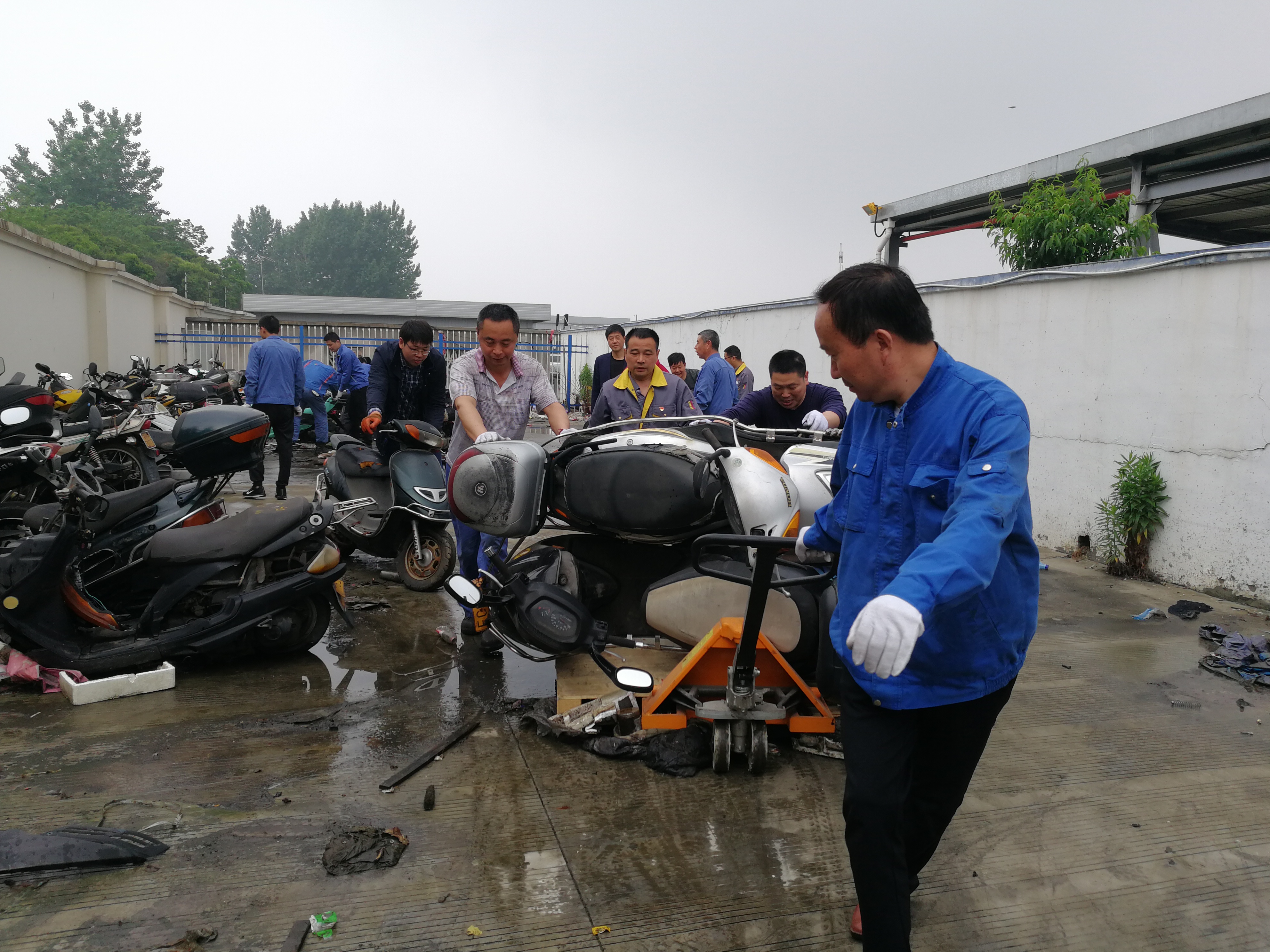 8時(shí)15分搬運(yùn)工作正式開始,針對輪軸銹蝕、車輪變形、車輪遺失、車輪鎖死等不同情況的扣押車輛,大家使用車輪托架、電動(dòng)三輪、托盤叉車等輔助搬運(yùn)工具,共同協(xié)作,聽從指揮,一步一步移至指定區(qū)域。經(jīng)過兩個(gè)半小時(shí)的高效協(xié)作,大家克服場地臟亂和天氣的悶熱,將靠近天燃?xì)饧託庹疽粋?cè)的車輛全部清理完畢,扣押場地車輛在指定停放區(qū)域擺放整齊,消除了安全隱患。