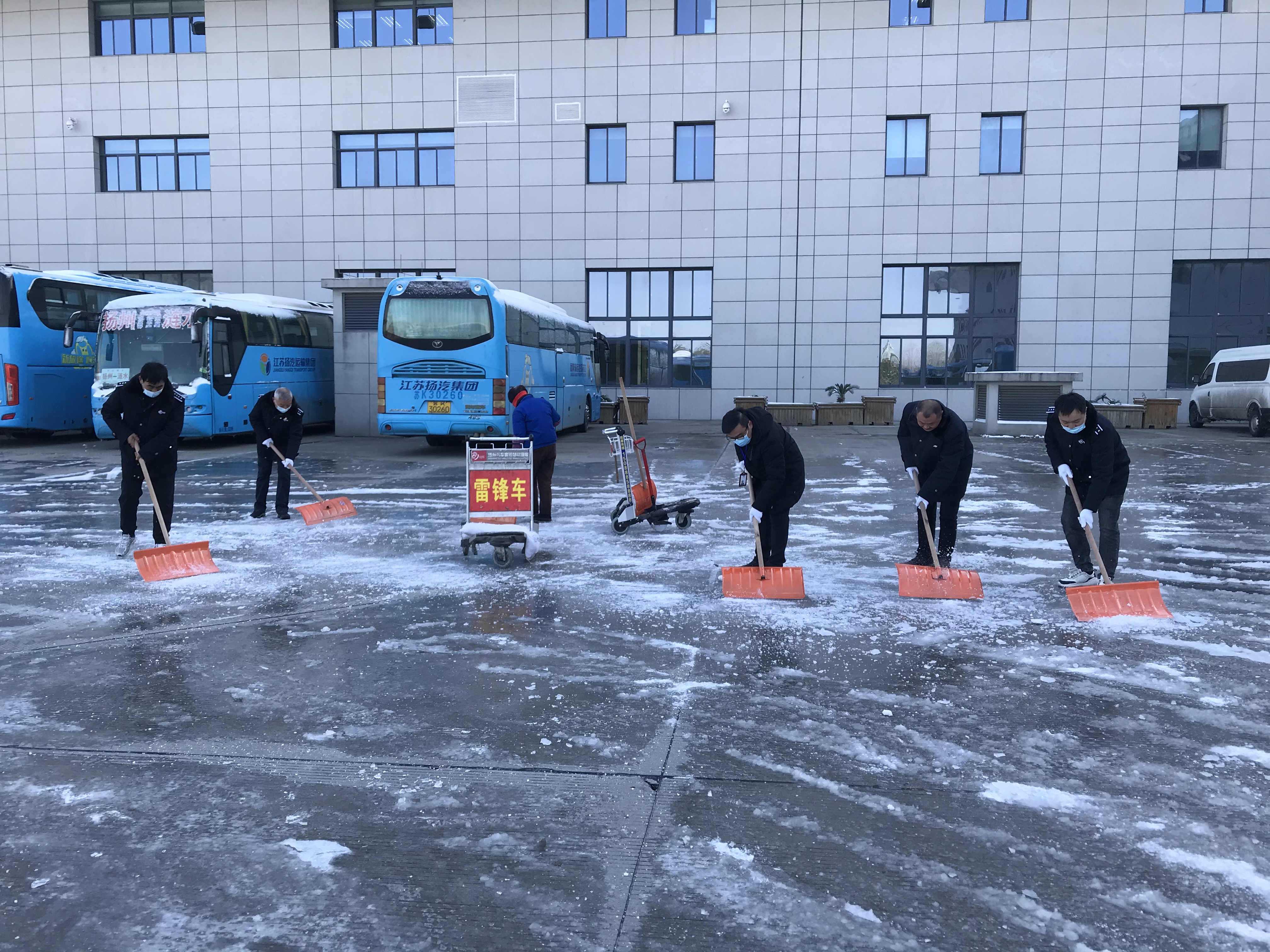 12月30日早上各黨支部積極響應(yīng)集團(tuán)黨委號召,組織黨員干部、管理人員協(xié)助車站清理積雪,在站前廣場、發(fā)車平臺,進(jìn)出站口等重點部位,大家拿著掃把、草墊、鐵鍬、雪鏟,充分發(fā)揮團(tuán)隊協(xié)作精神,干勁十足,一派熱火朝天景象,為班線開通做好后勤保障。