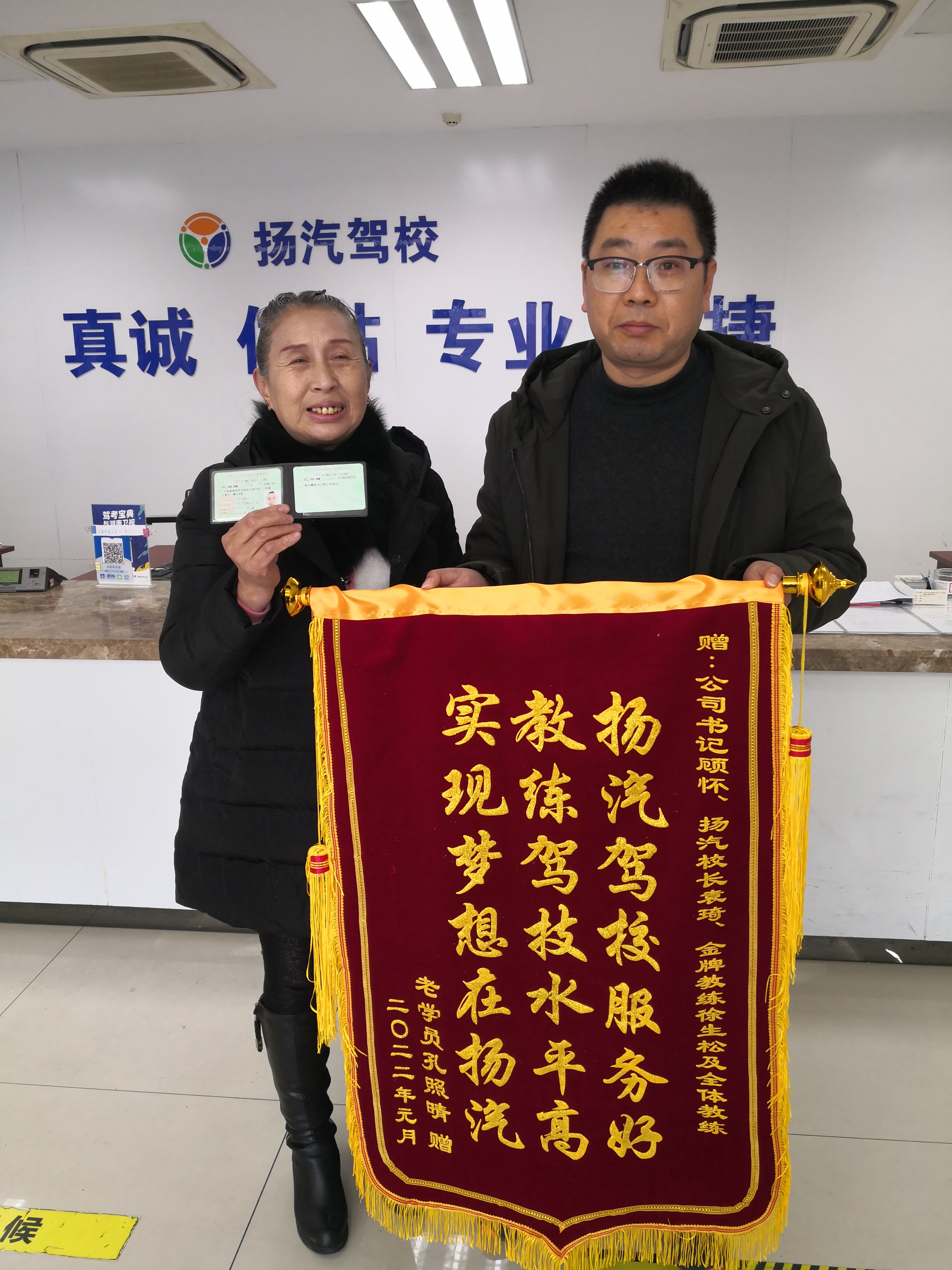 近日,67歲的孔大媽滿懷喜悅之情帶著新聞媒體的記者一同來到駕校,領(lǐng)取了她夢寐以求的駕駛證,同時為駕校送上了“揚(yáng)汽駕校服務(wù)好 教練駕技水平高 實現(xiàn)夢想在揚(yáng)汽”的錦旗。