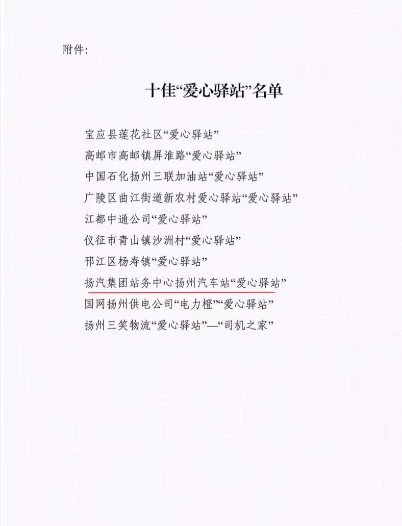 揚(yáng)州汽車客運(yùn)站榮獲市總工會(huì)十佳“愛心驛站”榮譽(yù)稱號