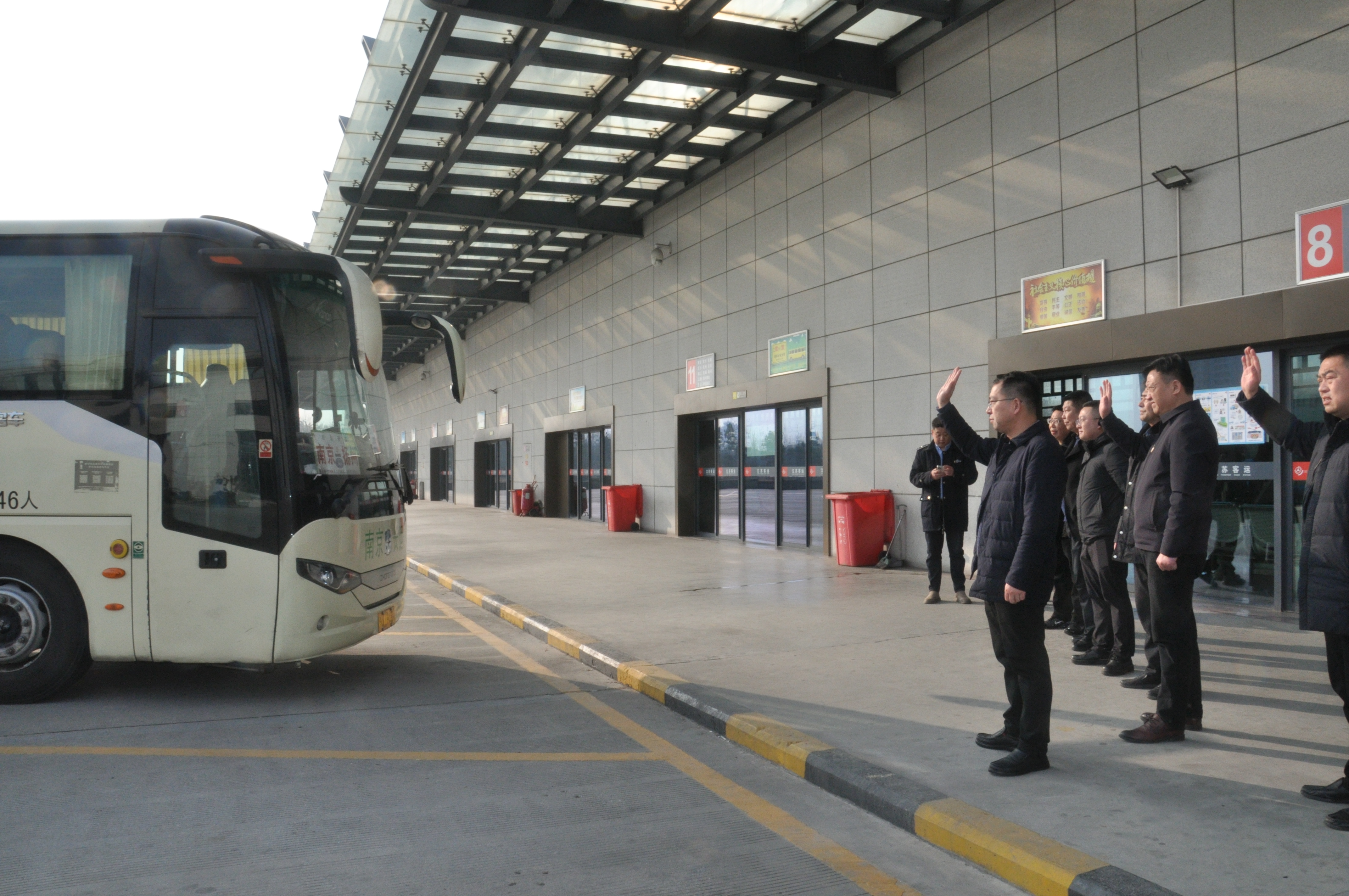 下午3點40分,發(fā)往南京南站的大巴正緩緩駛出車站。這是除夕當(dāng)天發(fā)出的最后一班“團(tuán)圓班車”。龔宇峰一行為最后一班車的旅客送上了新春的祝福,并再三囑咐駕駛員謹(jǐn)慎駕駛,確保將乘客安全送達(dá)目的地。他們還向堅守在一線的廣大干部職工表示了誠摯的慰問與關(guān)懷。在大家的揮手告別中,大巴車緩緩離開了發(fā)車平臺。至此,揚州汽車客運站節(jié)前的最后一批旅客踏上了返鄉(xiāng)的團(tuán)圓之路。